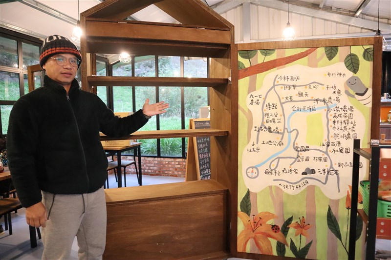 赤科山農村社區發展協會總幹事李光濱表示,書櫃的門板玻璃鑲嵌詞句介紹赤科山特色,但木板部分需要再美化,於是邀來2位大學生將山區旅遊地圖和金針花等意象彩繪上去,可愛童趣的畫面很吸睛。