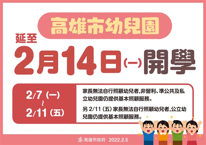 高雄公私立幼兒園 延至2月14日開學 |2022.02.05 語音朗讀 1083觀看次 字級 大 中 小 高雄市長陳其邁宣布,公私立幼兒園延至2月14日開學。圖╱高雄市府提供 【本報高雄訊】高雄本土案例接連增加,今天新增10例確診個案,高雄市政府考慮幼兒未接種疫苗,為預防感染風險,宣布所有幼兒園延後至2月14日開學。陳其邁說,小朋友都沒有打疫苗,較無抵抗力,幼兒園班上只要有一個小朋友感染,其他人就很容易感染。因此決定延後至2月14日開學,2月7日至11日期間,家長無法自行照顧者,園方會提供基本照顧服務。他同時要求,2月7日起幼兒園老師請接種第3劑疫苗,2月6日即可預約。圖╱高雄市府提供 前一篇文章 公德心如火花? 滿地炮竹垃圾留台東海濱公園 下一篇文章 11℃低溫冷到明晨 下周一迎鋒面全台有雨 熱門新聞 01【閃文集】 駝峰天使2025.11.0402台中新社花海 重現經典卡通2025.11.0603WTA、ATP年終賽 獎金創新高2025.11.0704佛光佈教師、友愛服務隊 精進行佛2025.11.0605《365日》贈嘉義香湖國際大飯店 佛光人結書香善緣2025.11.0606星雲大師全集【傳記】百年佛緣─生活篇 我的衣食住行 5 - 22025.11.0407星雲大師全集【傳記】百年佛緣─生活篇 我的衣食住行 5 - 32025.11.0508腸道是人體第二大腦 影響情緒睡眠免疫力2025.11.0409山本由伸 拚美職首座賽揚獎2025.11.0510古老金幣2025.11.05 訂閱電子報 台北市 天氣預報 台灣一週天氣預報 相關報導 西拉雅部落學校 傳承文化佛光山書蔬展開幕 聚焦天天行三好鳳凰將轉中颱 下周二雨勢最大佛光山大學校長論壇 盼教育融入佛法彰濱海上光電板火警 環團促追查健保補充保費變革 政院急踩煞車