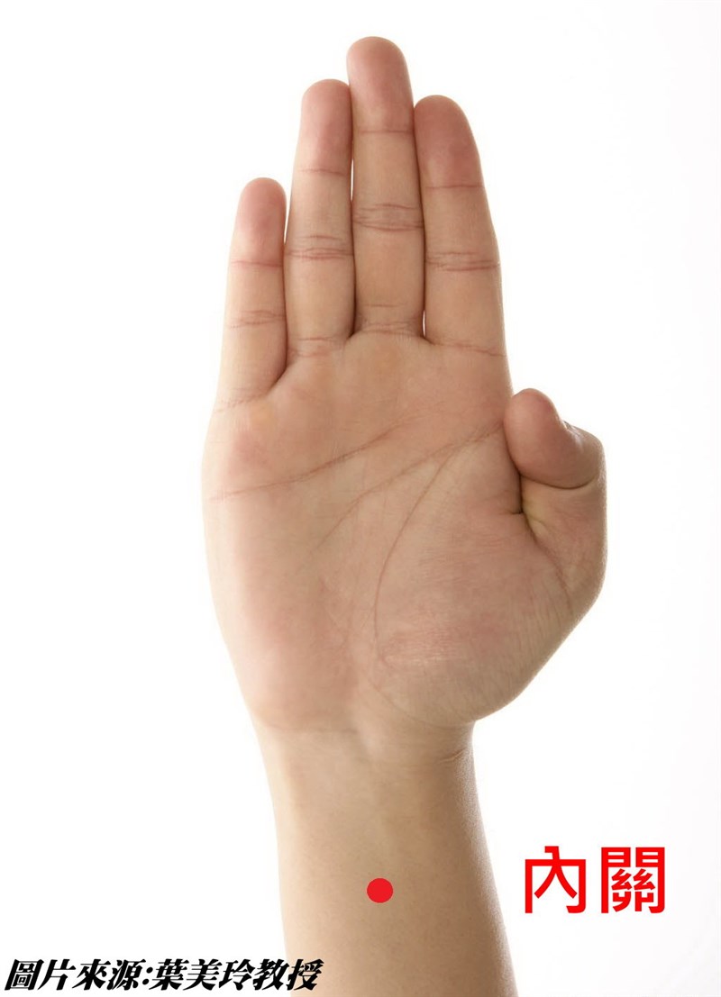 足三里位在膝蓋下約四橫指、脛骨旁開一橫指處;具有增強免疫力、調理脾胃、補中益氣、疏風化溼作用。內關穴(下圖,葉美玲教授提供)位在手腕橫紋中點往上三橫指寬,為兩筋之間;具有安神、和胃、寬胸及止嘔的功效。