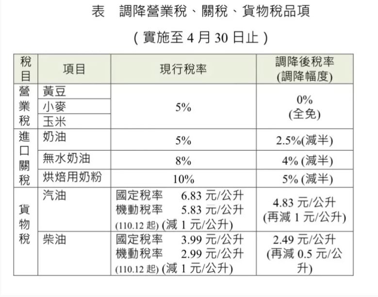 【本報台北訊】為穩定民生物價、減輕民生餐飲業者營運負擔,行政院長蘇貞昌今(6日)召開「物價及金融穩定議題討論會議」指示,自明日起至4月30日,免徵進口玉米、黃豆、小麥營業稅;奶油、烘焙用奶粉進口關稅減半、調降汽柴油貨物稅,以及天然氣民生用戶、液化石油氣(桶裝瓦斯)價格維持不調漲。