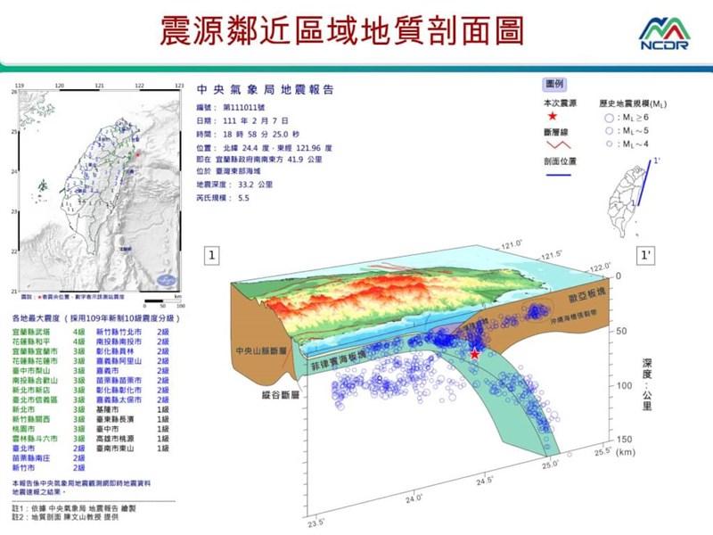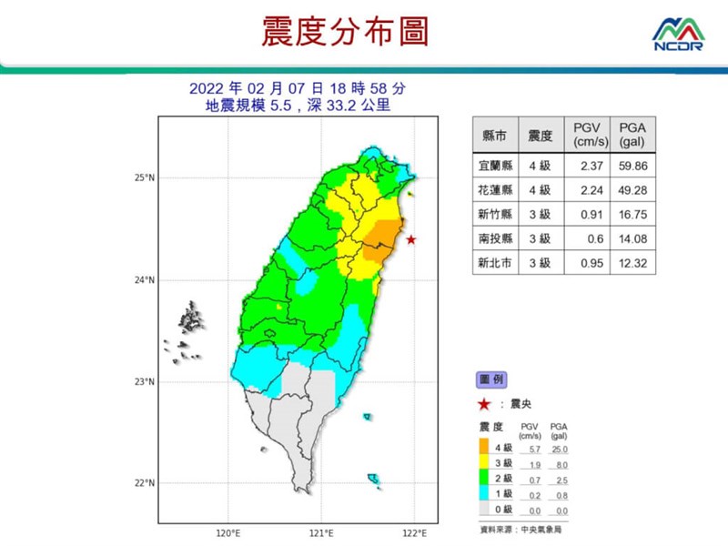 7日晚間宜蘭外海發生規模5.5地震,氣象局地震測報中心主任陳國昌表示,不排除3天內還會有規模4左右的餘震發生。圖/國家災害防救科技中心官方LINE帳號