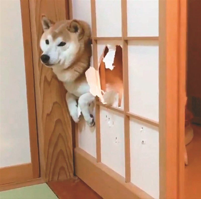 【本報綜合外電報導】當寵物橫衝直撞時候該怎麼辦?日本一名網友マルオ分享自家柴犬「佐佐木」的有趣畫面,只見柴犬一頭栽進日式和門,結果穿到一半身子卡住了,只能露出無奈的表情,可愛呆萌的影片甚至被節目推播出去。