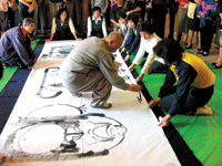 院院長梵舟法師,日前在佛光緣美術館屏東館當眾揮毫「達摩祖師、彌勒菩薩與和合二仙」,上款題「謹賀新年、佛光普照、世界一花」送給美術館,贏得全場熱烈掌聲。
