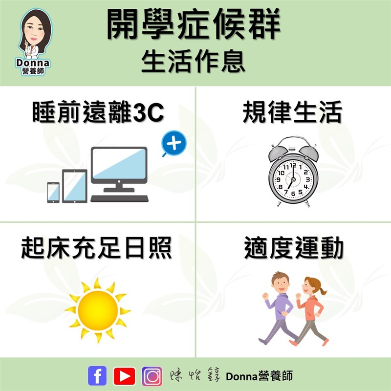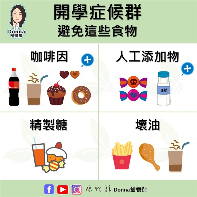 放9天上班好憂鬱 營養師教你遠離「開工、開學症候群」 |2022.02.10 語音朗讀 907觀看次 字級 大 中 小 9天春節連假結束了,家長們開工上班,而孩子們也準備要開學了,但假期間打麻將、追劇到半夜,作息恐怕已經大亂,導致年後不少人出現生理、心理的症狀,例如不安、失眠、頭痛、胸悶、想賴床、拉肚子,甚至小孩子特別黏人等。圖/健康醫療網 【本報台北訊】結束9天春節連假,家長們開工上班,而孩子們也準備要開學了。春節假期間打麻將、追劇到半夜,作息恐怕已經大亂,導致年後不少人出現生理、心理的症狀,例如不安、失眠、頭痛、胸悶、想賴床、拉肚子,甚至小孩子特別黏人等,營養師陳怡錞呼籲民眾,趕快趁這幾天回歸正常的飲食和生活作息,遠離「開工症候群」和「開學症候群」。開學(工)症候群,可能有哪些症狀呢?圖/Donna營養師-陳怡錞 保健營養專家1. 心理症狀:沮喪、焦慮、憂鬱、易怒、不安2. 行為症狀:健忘、失眠、沒食慾、沒耐心、想哭3. 生理症狀:頭痛、胸悶、肚子痛、拉肚子4. 其他症狀:咬手指、特別黏人、賴床、幼兒動手動腳因應開學(工)症候群,要避免這些食物:圖/Donna營養師-陳怡錞 保健營養專家1. 咖啡因:可樂、奶茶、茶飲、巧克力,過度刺激大腦並影響睡眠。2. 人工添加物:尤其是人工色素、味精、高鈉食物,會增加孩子過動現象。3. 精製糖:促進發炎反應、傷害大腦。4. 壞油:包含高溫烹調和反式脂肪,促進發炎反應、傷害大腦,並會使腦細胞變得遲鈍。開學(工)症候群,要多攝取這些食物:1. 蛋白質:是人體合成神經傳導物質必備的材料,多攝取豆類食物。2. 維生素B群:維持神經細胞正常運作必備之營養素,來自奶、全榖、深綠色蔬菜、豆類食物。3. ω-3好油:讓腦細胞膜流動性變好、腦細胞靈光,來自亞麻籽、亞麻仁油、印加果油。4. 鈣、鎂:有助於紓壓放鬆、鎮定、提升睡眠品質,鈣來自於奶類、黑芝麻、板豆腐,鎂來自於堅果和深綠色蔬菜。開學(工)症候群,生活作息這樣調整:圖/Donna營養師-陳怡錞 保健營養專家1. 睡前一小時遠離3C:減少藍光過度刺激,避免影響睡眠。2. 規律生活:逐漸提早睡眠時間,即便是放假也要固定睡覺和起床時間。3. 起床充足日照:起床後接觸日照5~10分鐘,透過強烈光線告訴大腦該起床工作了,有助於調整生理時鐘。4. 適度運動:幫助紓壓、對抗焦慮,且戶外運動晒太陽還可獲得維生素D。報導來源:健康醫療網 前一篇文章 新聞千里眼 下一篇文章 避免坐出身體疼痛 醫授「三個90度」減輕腰負擔 熱門新聞 01【詩】 寫在秋分之前2025.10.1402昆士蘭青年成長營 個個都是馴龍高手2025.10.1303星雲大師全集【經義】佛法滿人間—善因妙果2025.10.1304足球場成教室 貧童踢出希望2025.10.1305六龜祕湯溫泉季 開跑2025.10.1306人間佛教青年論壇 研討共生與共榮2025.10.1307白鷺江邊小憩2025.10.1308建築的恐懼與療癒 新北美術館展出 2025.10.1309【父母親的話】 民國初年的戀愛故事2025.10.1310【玉子手札】擱淺藍鯨 重生獨白2025.10.13 訂閱電子報 台北市 天氣預報 台灣一週天氣預報 相關報導 海軍操演落幕 陸空演訓下旬登場台中會展中心首展 五金工具擔綱中科院輔力外骨骼系統 20公斤砲彈輕鬆舉共軍登陸駁船曝光 外媒:航向世界三戰國家檔案館以史為鏡 照見現在與未來美參院強烈鼓勵 邀台環太軍演
