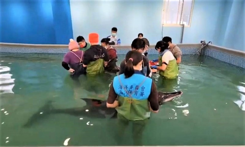 蔡馥嚀說,在救援第一現場初判是雄性個體,但昨天晚上進入救援池後再仔細檢查,確定為1隻公的、2隻母的,其中1隻母的懷有胎兒,經超音波檢查是活著的且心跳正常,獸醫師檢查後離分娩還有數個月時間。因為有氣泡發生,還要觀察,救援團隊會視檢驗報告,再決定是否野放的判斷。