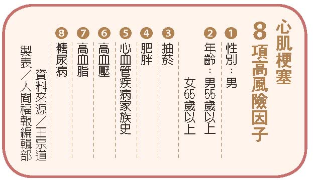 除了三高疾病外,心肌梗塞危險因子,還包括性別(男)、年齡(男五十五歲以上、女六十五歲以上)、抽菸、肥胖、心血管疾病家族史等八大因子。王宗道表示,如果八大高風險因子中,已有三項、甚至三項以上,就應自我警惕,盡早戒菸、控制體重、養成運動習慣,三高患者規律用藥,天冷時,則需注意保暖。