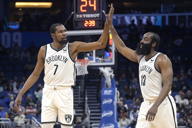 杜蘭特(左)在明星賽選秀刻意避開被籃網交易去76人的前隊友哈登(右)。圖/美聯社