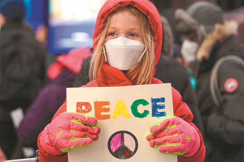 示威者在紐約時報廣場,抗議美國軍事介入烏克蘭問題,一名女孩舉起和平標語。圖/法新社