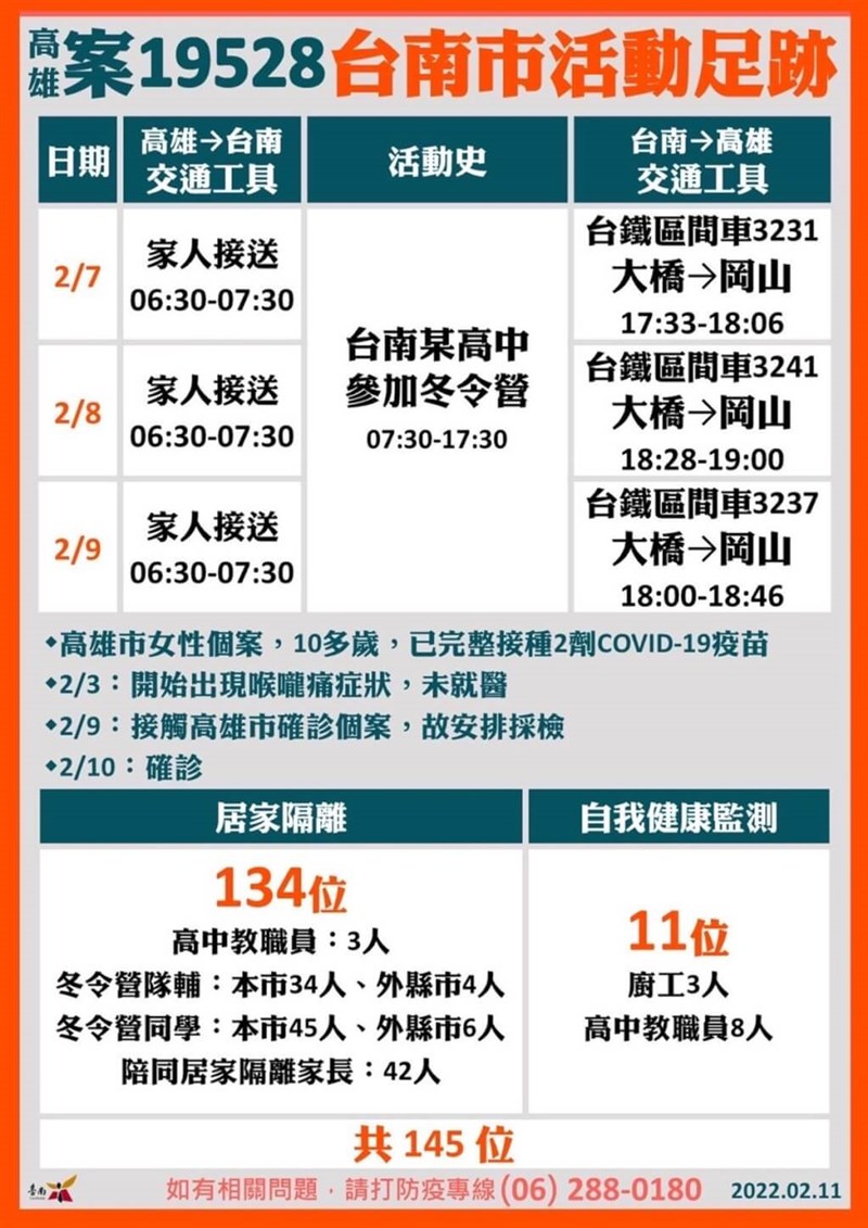 台南市長黃偉哲表示,案19528家住高雄,在台南市就讀某高中,曾於7日、8日、9日到學校參加冬令營活動,擔任隊輔老師,因接觸者中有部分是沒有打過疫苗的12歲以下學童,因此採擴大匡列,共匡列145名相關接觸者,其中134人居家隔離、11人自我健康監測。