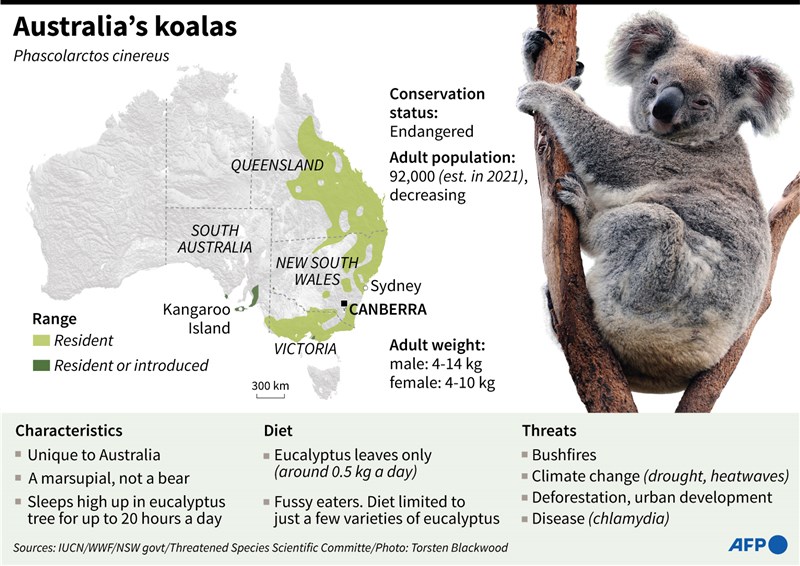 《衛報》報導,由於土地清理和災難性的叢林大火縮小其棲息地,澳洲政府正式將無尾熊列為瀕危物種。圖╱法新社