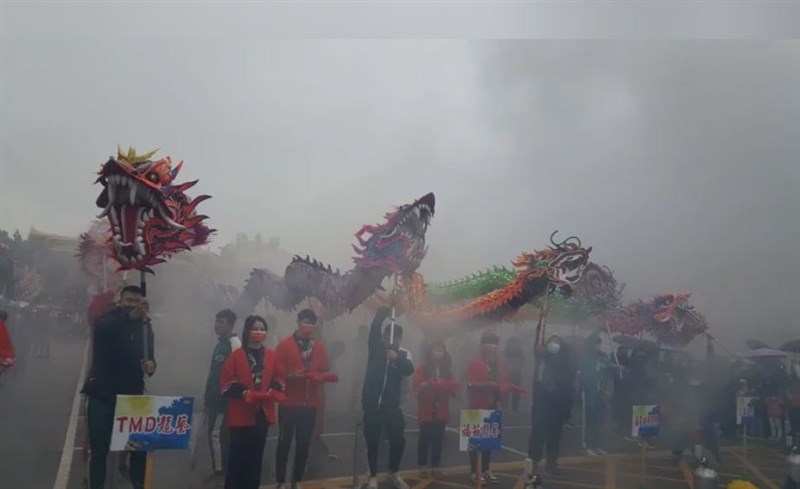 傳統活動苗栗𪹚龍,10日在信仰中心苗栗市玉清宮進行點睛,龍群在雲霧中舞動活靈活現。圖/胡蓬生