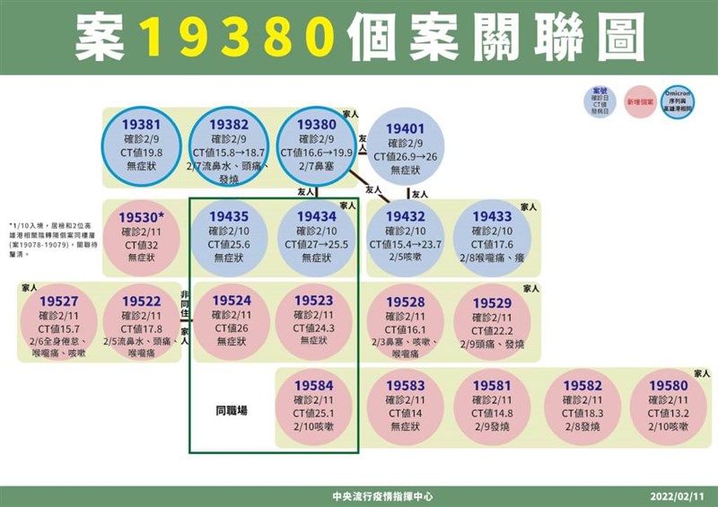 陳時中指出,今日高雄親友案(10歲童和兩表哥及其大表哥女友)累計8人確診,由大表哥(案19380)延伸出一起砂石場家庭群聚,再增加12人確診,全案累計20人確診。