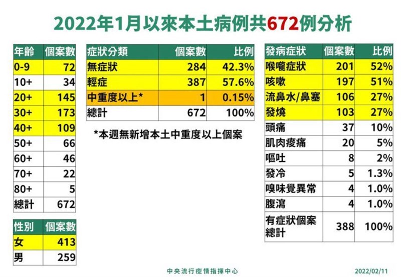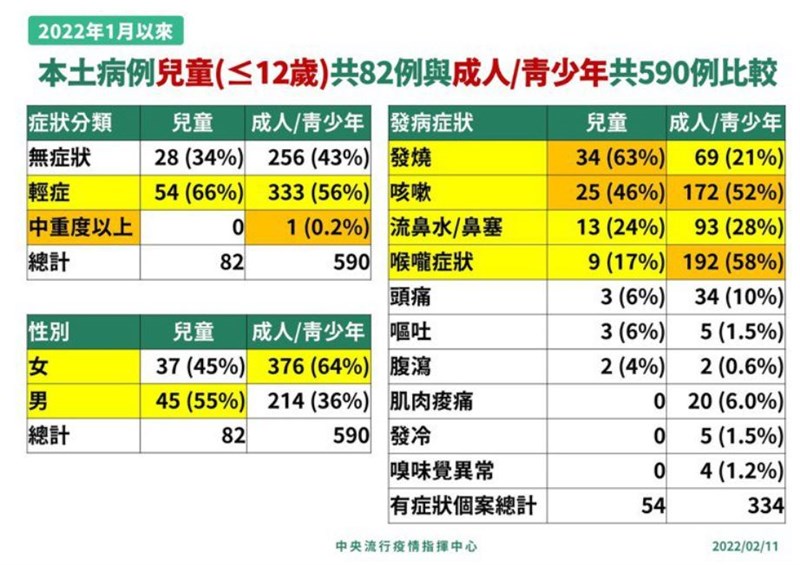 Omicron症狀最新統計 兒童、成人大不同 |2022.02.11 語音朗讀 3299觀看次 字級 大 中 小 兒童和成人、青少年染Omicron症狀大不同,兒童最常見的狀況是發燒。圖/123RF 【本報台北訊】中央流行疫情指揮中心今(11)日公布,目前Omicron共有246本土個案及439境外移入個案,總計685例。醫療應變組副組長羅一鈞說,兒童與成人及青少年染疫後,性別比例、染疫症狀均不同,兒童四大症狀為發燒、咳嗽、流鼻水及鼻塞、喉嚨症狀,成人及青少年則為喉嚨症狀(痛、癢)、咳嗽、流鼻水及鼻塞、發燒。羅一鈞表示,今年1月以來共672例本土Omicron個案,近一周0至9歲的個案數略為增加,共有72人確診。其餘年齡層仍多為20至40歲民眾,女性為413人,男性有259人,中重度症狀維持1人中度肺炎,輕症患者387人,無症狀有284人。依指揮中心資料,兒童輕症患者有54人、占比為66%,無症狀患者有28人、占比為34%,而成人及青少年輕症患者有333人、占比為56%,無症狀患者有256人、占比為43%,重症患者有1人、占比為0.2%。因此,成人及青少年無症狀患者多於兒童,但兩者相差不大,且不論是兒童、成人及青少年症狀多為輕症。圖/指揮中心性別方面,男童有45人、占比為55%,女童有37人、占比為45%,對比成人及青少年的男性有214人、占比為36%,但女性有376人、占比為64。分析發現,兒童患者男多於女,成人及青少年患者則是女多於男,可能為近期移工群聚個案多是女性,以及兒童染疫後,照顧者多為女性,造成隨後也被傳染所致。分析發病症狀方面,兒童發病54人,四大症狀排序為發燒34人、占比為63%,咳嗽25人、占比為46%,流鼻水及鼻塞13人、占比為24%,喉嚨症狀9人、占比為17%;對比成人及青少年為喉嚨症狀192人、占比為58%,咳嗽172人、占比為52%,流鼻水及鼻塞93人、占比為28%,發燒69人、占比為21%,兩者排序大不相同。圖/Unsplash至於1月本土672例Omicron症狀前四名,分別為喉嚨症狀201人、占比為52%,咳嗽197人、占比為51%,流鼻水及鼻塞106人、占比為27%,發燒103人、占比為27%。羅一鈞說,對比上周為咳嗽排名第一,喉嚨症狀第二,本周名次再度互換,但兩者占比均為50%左右,而流鼻水、鼻塞人數,稍微超過發燒,但沒有明顯變化。圖/指揮中心 前一篇文章 故宮南院展國寶 九層千佛石塔展現精湛工藝 下一篇文章 T1/兒子親筆獻祝福 張智峰復出感謝老婆成全 熱門新聞 01佛光山365日越文版 贈西貢日航大酒店2026.03.2702紅綠葡萄抗氧化抗發炎 連皮吃獲取健康全效益2026.03.2703台灣工藝3專書 呈現文化獨特樣貌2026.03.2704中職37年 明大巨蛋開幕戰2026.03.2705博鰲論壇 黃循財:支持陸加入CPTPP2026.03.2706南華創校30年 百年樹人邁向永續2026.03.2707照明工具 原理與演進2026.03.2708西半部冬季降雨75年新低 新竹水情亮黃燈2026.03.2709把握遠視儲備期 防兒童近視惡化2026.03.2710人間佛教聯合總會訪三燭寺 互勉弘法利生2026.03.27 訂閱電子報 台北市 天氣預報 台灣一週天氣預報 相關報導 中美並重 鄭麗文傳6月訪美景氣分數衝高 燈號連3紅8萬小草力挺 柯:我不投降 718億新興計畫預算 政院不動 能源漲價 央行逐季檢視通膨京華城案 柯文哲重判17年