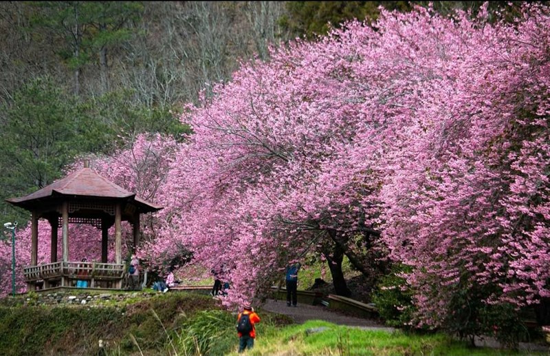 武陵農場內有10幾種品種櫻花,預估3月初,都還能見到櫻花美景。圖/武陵農場提供