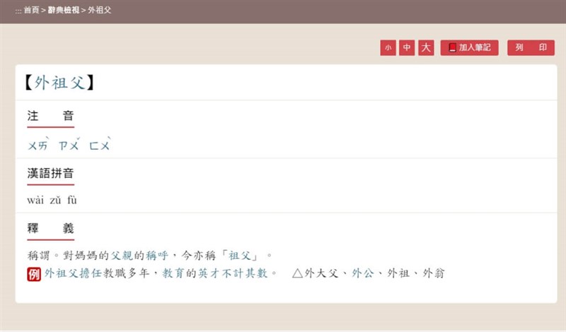 教育部國語辭典將外祖父、外祖母的解釋調整,加註「今亦稱祖父、祖母」,不再有內外之分。圖/取自教育部國語辭典簡編本網頁dict.concised.moe.edu.tw