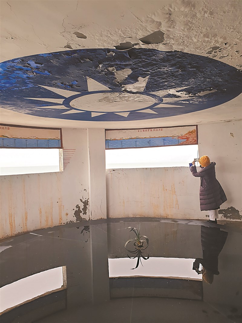 藝術家王文心的〈拜訪瓊麻2〉,讓地面的水成為捕捉環境的裝置,配上海浪聲,將荒廢的軍事據點變成充滿詩意的藝術空間。圖╱陳宛茜