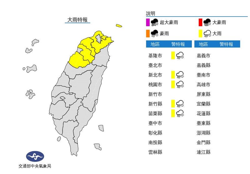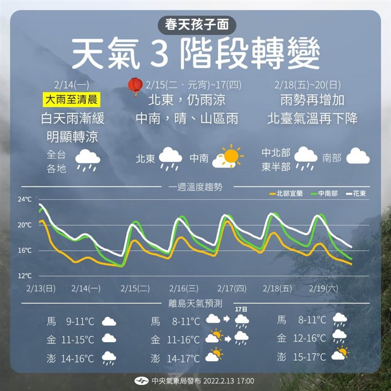 全台5縣市大雨特報 吳德榮:午後雨緩轉冷 |2022.02.14 語音朗讀 627觀看次 字級 大 中 小 氣象局14日針對新北、桃園等5縣市發布大雨特報。圖/中央社 【本報台北訊】氣象局今天針對新北等5縣市發布大雨特報。氣象專家吳德榮表示,上午鋒面籠罩,中部以北明顯降雨,午後西半部雨漸停,今晚、明晨本島平地最低氣溫下探攝氏11度。中央氣象局今天發布大雨特報,鋒面影響,基隆、新北、桃園、新竹及苗栗地區有局部大雨發生。根據氣象局網站,今天截至上午8時,累積雨量以桃園市八德區45.5毫米最多,其次為新竹縣五峰鄉44毫米;累積雨量前10名地區大多位於新竹一帶,另外包含桃園、苗栗。圖/取自中央氣象局網頁cwb.gov.tw中央大學大氣科學系兼任副教授吳德榮今表示,今晨鋒面雲系籠罩、伴隨降水回波,中部以北明顯降雨,台南亦有零星降雨。吳德榮指出,最新歐洲模式模擬顯示,今天強冷空氣影響,各地轉冷;下午起鋒面雲系逐漸脫離,西半部雨漸停、轉多雲,東半部仍有局部短暫雨。今晚、明晨輻射冷卻加成,本島平地最低氣溫下探11度,「乍暖還寒」,注意調適。根據氣象局網站,今天截至上午8時,本島平地最低溫為台中市大甲區11.8度、桃園市楊梅區12.1度。吳德榮表示,最新模式模擬顯示,明天白天起至16日氣溫小幅回升、仍偏冷;明日西半部多雲時晴,山區、大台北東側及東半部偶有局部短暫雨,16日大台北亦有局部短暫雨;17日轉東南風,西半部多雲時晴易有霧,大台北東側及東半部偶有局部短暫雨,白天起氣溫回升。吳德榮說,最新模式模擬顯示,18日下一波鋒前雲系移入,有局部短暫雨,水氣增多,易起霧;18日晚間「鋒面」抵達,明顯降雨;19日強冷空氣南下,天氣轉冷。強度較前波強;20日氣溫降至最低。但為期末模擬、各國模式皆在調整中,有待後續觀察。圖/取自facebook.com/CWB.TW 前一篇文章 核二廠2號機主汽機異常關閉 原因待查 下一篇文章 每天吃足蔬果仍便祕? 恐是腸胃有寒溼、虛氣 熱門新聞 01【讓愛自由】纏繞與獨立之間2026.04.0202新生首次到校2026.04.0203明德水庫蓄水量僅27% 今起供4停42026.04.0104星雲大師靈骨分燈日本 法燈長明2026.04.0105星雲大師靈骨分燈泰國 化益世人2026.04.0206東京櫻花滿開2026.04.01079公尺高恐龍 現身澄清湖2026.04.0108中美並重 鄭麗文傳6月訪美2026.04.0109打字機重返課堂 對抗AI代寫2026.04.0210睽違53年 NASA載人繞月1日升空2026.04.01 訂閱電子報 台北市 天氣預報 台灣一週天氣預報 相關報導 台澎海空疏運高峰 逾8千人提前返台海軍敦睦艦隊 進入巴拿馬運河中油高雄大林廠火警 環保局開罰桃機3航廈屋頂 設10公里天溝國民黨中常會 提名台中、澎湖、竹縣長中美並重 鄭麗文傳6月訪美