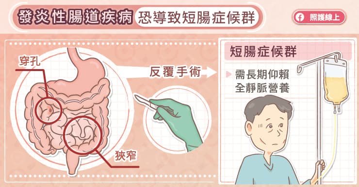 「短腸症候群」是指小腸因為大範圍的慢性發炎或手術切除而喪失消化、吸收功能,導致患者營養不良而需要終身接受靜脈或腸道營養補充。也因此,郭震亞醫師提醒,克隆氏症病友更需要積極治療控制腸道發炎,降低需要切除腸道的風險,以避免短腸症候群的發生。