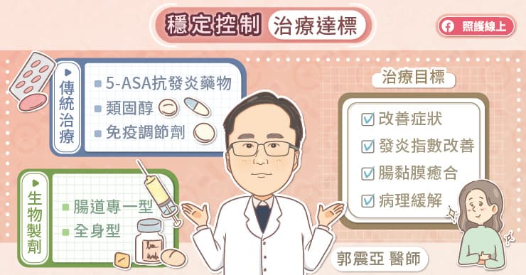 貼心小提醒發炎性腸道疾病是自體免疫疾病,無法完全治癒,但目前已經有成效良好的藥物可以穩定控制發炎,改善預後。郭震亞醫師叮嚀,治療目標除了要改善腹痛、腹瀉、血便等症狀,更重要的是達到腸黏膜癒合,以降低出現嚴重併發症的機會,避免動刀切腸子!