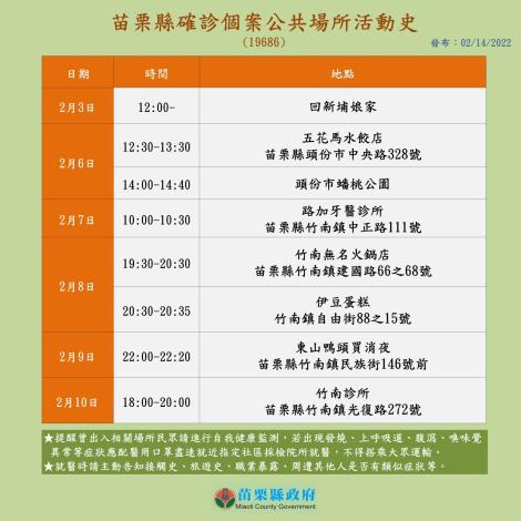 苗栗縣政府上午召開疫情說明記者會,公布新增1名確診者案19731,是45歲女性,職業為竹南第二公有市場攤販,足跡包括竹南龍鳳宮、頭份尚順育樂世界湯姆熊、獅潭賞櫻祕境協雲宮及多家餐廳等。