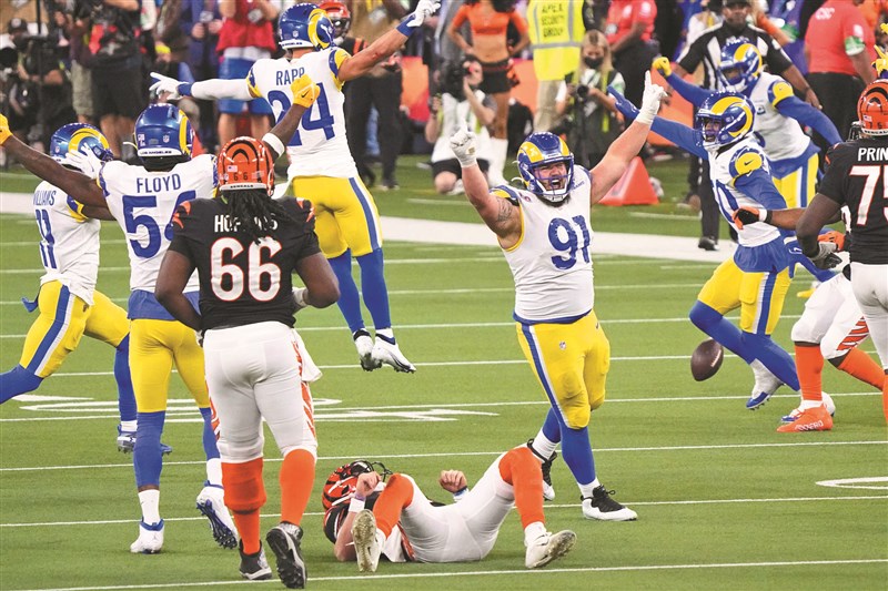【記者曾博群綜合外電報導】美國國家美式足球聯盟(NFL)年度盛會超級杯13日開打,主場洛杉磯公羊靠明星接球員庫普(Cooper Kupp)在最後階段挺身而出,終場前1分25秒關鍵達陣逆轉戰局,以23:20擊敗辛辛那提孟加拉虎,隊史相隔22年再奪冠,庫普也拿下第56屆超級杯MVP。