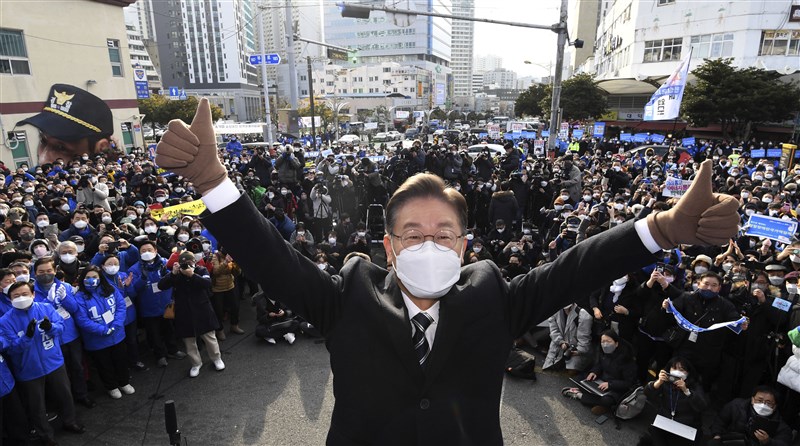 南韓總統大選競選活動15日起跑,執政黨候選人李在明在釜山活動。圖/美聯社