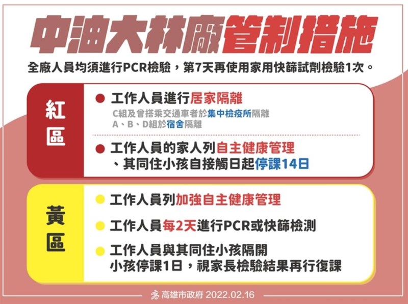 中油大林廠3確診 2300全員篩檢 |2022.02.16 語音朗讀 606觀看次 字級 大 中 小 中油煉油廠出現3確診,高雄市衛生局15日進駐廠區,進行疫調及相關人員的篩檢、匡列隔離,16、17日兩天全廠2300名員工全部篩檢。圖/劉學聖 【本報高雄訊】高雄今(16)日新增6例,中油大林煉油廠3例、高雄幼兒園傳播鏈新增2例,是一對父女染疫,據了解,這一家人是曾到宜蘭礁溪某飯店旅遊而受感染。另1例則是高港傳播鏈,目前沒有發散,屬於穩定情形。中油大林煉油廠一名員工昨出現症狀快篩陽性,送醫院PCR檢測確診,高雄市衛生局昨進駐廠區,進行疫調及相關人員的篩檢、匡列隔離。今、明兩天全廠2300名員工全部篩檢。中油煉油廠今3人確診,其中案19863是一名30多歲男性,被推測是這一職場群聚的指標個案,他2月11日發病,2月16日確診,Ct值21.20。推測是案19863感染後,又傳給另2名一同上班同事,這2名同事分別在2月12日、2月15日發病;高雄市衛生局比對足跡,中油煉油廠員工有到確診紅茶店消費過,懷疑是如此感染。圖/高雄市政府衛生局也公布大林煉油廠確診者足跡,遍及小港區、苓雅區、鳳山區、左營區、楠梓區。包括大遠百威秀影城、老江紅茶鳳山店、全家大林蒲門市等。確診者屬中油第十二蒸餾工場,目前沒有因為確診者而停爐,因為中油是4班3輪,出現確診者的那一班,大家都被匡列隔離;其他3班仍照常輪班,但是採團進團出,住在同個地方,暫時無法回家。圖/中油提供由於確診者為搭交通車上下班,因此搭同車的員工也被匡列隔離,交通車徹底清消。疫調交通車同班車有23人,都列為親密接觸者。中油各廠區、事業部,對此也進行預防性措施,緊急調度分流分艙上班,交接後立即清消。至於高雄幼兒園傳播鏈衍生的確診父女,他們是被日前確診的同住家人感染 ,屬匡列中的對象,等於一家有4人中鏢。 前一篇文章 植樹有成! 農委會林試所選拔170處私有林模範生 下一篇文章 怎樣保養不顯老?中醫:養肝、植物性荷爾蒙可維持年輕 熱門新聞 01佛光山大學校長論壇 盼教育融入佛法2025.11.0802補充纖維、鈣、鎂、鉀 預防多種疾病風險2025.11.1103星雲大師全集⑲【佛教管理學②】禪門的管理法⑦2025.11.0804【養生百味】冬食淡素 防範疾病2025.11.0805更年力綻放 迎向第二黃金人生2025.11.0806電塔變身巨獸 奧地利新地標2025.11.0807鳳凰將轉中颱 下周二雨勢最大2025.11.0808陸航母福建艦服役 首採電磁彈射2025.11.0809【樹博士系列】土壤的祕密XV 水稻田減排新觀念IV 土地的溫柔革命 雲林大埤寫益生菌奇蹟2025.11.0910高市早苗:台灣有事 日本擬行使集體自衛權2025.11.08 訂閱電子報 台北市 天氣預報 台灣一週天氣預報 相關報導 修舊如舊 瑞三礦業整煤廠再生通霄電廠閃鳳凰 大煙囪「放倒」台近7成員工薪資 低於平均訪歐返台 蕭美琴:處境艱難不退縮魏哲家:黃仁勳來要更多晶片興達電廠 應變演練