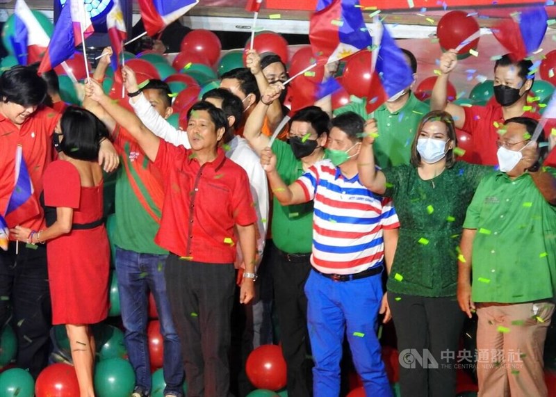 菲律賓總統大選逼近,民調顯示,總統候選人小馬可仕支持率高達6成,邁向總統大位聲勢看好。圖為小馬可仕(左前)和副手薩拉.杜特蒂(右2)8日在造勢大會揮舞菲律賓國旗。圖/中央社
