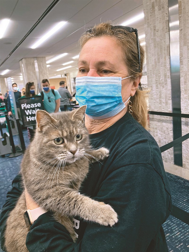 走失七年的Ashes在飼主丹尼絲的友人威廉斯陪伴下,在佛州機場準備搭機回家與飼主團聚。圖╱美聯社