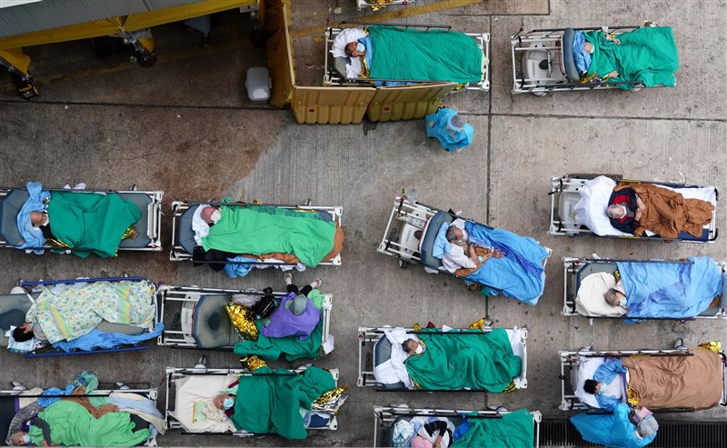 隨著確診人數持續暴增,香港各大醫院已難以負荷大批湧入的病患,明愛醫院部分患者就被迫安置在院外露天病床。圖╱中新社