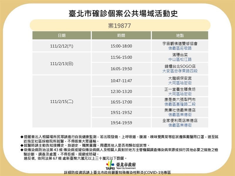 北市3確診Ct值低 捷運、台鐵人潮處皆有足跡 |2022.02.17 語音朗讀 1184觀看次 字級 大 中 小 捷運站有確診者足跡,進行清消。圖╱資料照片 【本報台北訊】北市衛生局今天公布3例本土確診個案狀況與足跡,以及新北市個案足跡。案19878為20多歲女性,在北投某溫泉飯店工作,16日PCR陽性確診,Ct值26.7;案19877及19882皆為50多歲女性,居住信義區,因宗教活動有共同足跡,因出現症狀前往採檢昨日確診,Ct值分別為18.98和14。案19878為20多歲女性,居住於台北市北投區,因16日得知2位家人(桃園案19763、案19861)於15日確診,個案16日採檢PCR陽性確診,Ct值26.7;案19878於北投區飯店泡湯區工作,目前匡列該飯店員工4人居家隔離,泡湯區17日至19日停業3天,全體員工安排採檢,北市衛生局將發送簡訊通知14日至16日,曾至該飯店消費之顧客進行採檢。圖/北市衛生局提供另外,案19877和案19882共同出席宗教活動、80多人聚餐,結束後又前往KTV續攤。案19877於2月16日出現咳嗽、喉嚨痛等相關症狀,16日採檢PCR陽性確診,Ct值18.98;案19882於2月15日接獲友人確診後,2月16日在家自行快篩陽性,同日檢驗PCR陽性確診,Ct值14。衛生局表示,案19877、19882及案19816合計匡列203人居家隔離,尚在檢驗中,已安排13人擴大採檢皆為陰性,共發送1652封簡訊通知足跡重疊者,相關公共場域皆以進行清消,疫情調查與防治工作持續進行中。另外,北市確診個案19878、9877和19882,足跡遍布捷運、台鐵和宮廟等人潮眾多處。包括大地酒店、捷運北投站、台北車站和桃園車站與醫美診所,還有錢櫃台北SOGO店、滿穗台菜、宇宙觀佛道雙修協會、大龍峒保安宮、松山慈祐宮、捷運麟光站、台北法主公廟、捷運松江南京和南京復興站等處。圖/北市衛生局提供 前一篇文章 島內移動夯! 國道車流量增 日平均成長量2% 下一篇文章 巴黎「藝術之都」國際沙龍展開幕 台灣9名藝術家參展 熱門新聞 01MLB太空人打敗洛磯 鄧愷威中繼成功2026.04.1602法全票通過 掠奪文物歸還中國2026.04.1703勞動部將研議 勞退舊制移入新制2026.04.1804佛光山線上佛學院開學 逾百學員雲端共學2026.04.1505【詩】靜寂 2026.04.170645%失智症可預防 類黃酮食物護大腦2026.04.1607【詩】春天的孤挺花2026.04.1608多倫多佛光山寺院體驗營 青年探索內心2026.04.1609星雲大師紀念特展 紐西蘭一館開幕 2026.04.1610新馬寺領袖培訓營 小學生奮起飛揚2026.04.15 訂閱電子報 台北市 天氣預報 台灣一週天氣預報 相關報導 體驗超輕航機 5月報名都市林10年計畫 打造樹蔭通勤廊道還地於河 磺港溪重生花蓮推友善賞鯨 找回觀光人氣淡江大橋路跑 7000人參與勞動部將研議 勞退舊制移入新制