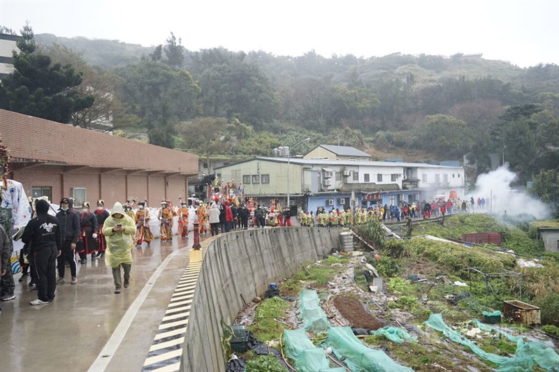 馬祖東引白馬尊王出巡日,地方17日起展開為期3天遶境、擺暝盛事,陣頭隊伍在低溫中冒雨出宮,展開長達3至4小時的儀式。圖/中央社