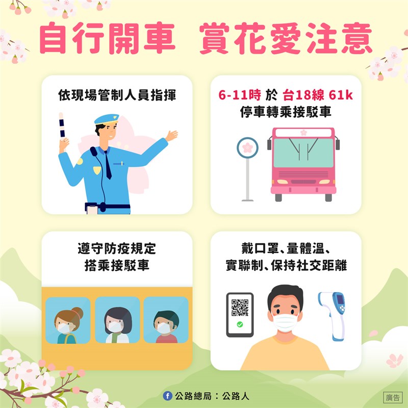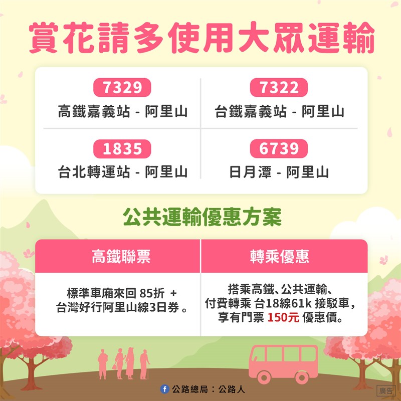 阿里山花季3/10登場!交通管制出爐 接駁客運3/1起畫位 |2022.02.18 語音朗讀 1380觀看次 字級 大 中 小 阿里山花季交通管制懶人包。圖/公路總局提供阿里山花季交通管制懶人包。圖/公路總局提供疏運措施簡圖。圖/公路總局提供 【本報嘉義訊】一年一度阿里山花季即將於3月10日開始,並持續至4月10日。交通部公路總局說,花季期間的例假日及連續假期的上午6時至11時將進行交通管制,管制日總計12天。全天人數管制16000人。由於小型車無法上山,接駁客運車票將自3月1日起開放民眾預約畫位。按照規畫,3月12日、13日、19日、20日、26日、27日;4月2到5日、9、10日,共計12個假日實施交通疏運管制措施。管制人數部分,上下午各8000人,全天16000人。其中團客、散客管制時段內11000人,管制時段外3000人,住宿是2000人。公總說,自行開車前往賞花的民眾,花季期間的例假日及連續假期上午6時至11時,台18線66k湖底處至88.2k阿里山國家森林遊樂區,除持相關證明文件(如工作證或住宿證明)或特殊情形(如婚喪喜慶)外是禁止小型車通行,請民眾於台18線61k樂野服務區轉乘接駁客運上山。公總說,接駁客運的車票將於111年3月1日(二)零時起開放民眾預約畫位,可至全台統一、全家及萊爾富便利商店和欣客運售票系統,依搭車日期、時段及停車空間,選擇適合之班次預約購票畫位,再按預約時間轉乘客運至阿里山國家森林遊樂區。林務局嘉義林管處說,因遊樂區內停車空間有限,於台18線88.5-95K往塔塔加方向路肩規畫小客車臨時停車格,並設置10處臨時接駁車站,於平日8到18時及假日5到18時提供遊客免費接駁往返阿里山入口轉運站的貼心服務。公總說,團體旅遊的遊客,假日及連續假期上午6時至11時請於台18線29k(五虎寮橋下游300公尺處)先行購買門票,並請先行統計完成團體遊客所需票種及配妥相關證明文件,以加速購票作業時間;另台18線29k僅開放購票人員下車購票,其他遊客如有休憩需求,請往前至阿里山國家風景區觸口遊客中心或其他休閒遊樂區進行休憩。公總說,除了上述團體旅遊、自行開車轉乘接駁公車前往賞花外,更鼓勵遊客搭乘公共運輸前往,到阿里山可搭乘的客運路線包含【高鐵嘉義站─阿里山】、【台鐵嘉義站─阿里山】、【台北轉運站─阿里山】、及【日月潭─阿里山】等四條路線,遊客可憑車票享入園門票七五折、150元優惠價(原價200元),搭乘高鐵也有享車票85折的高鐵聯票優惠。林管處說,遊樂區同時提供電子門票,且即日起至111年4月30日止,至「森林好好玩」網站( https://forestpass.welcometw.com/ )購買全票門票即享買一送一優惠,贈送的門票可使用至12月31日。林管處說,園區內有31種櫻花,數量總計逾2800棵,目前可觀賞到已盛開的山櫻花、阿龜櫻,而小櫻王-唐實櫻及櫻王-染井吉野櫻預計2月底至3月上旬陸續綻放,除此之外大島櫻、重瓣櫻花類及其他非櫻花花種如白木蘭、紫玉蘭、杜鵑、紫藤等將接力開花至4月份。至於今年會不會和武陵農場一樣,花況提前導致路況塞爆。林管處說,要看後續天氣變化,但預估花期應該不會提早。 前一篇文章 冷氣團升級寒流19日起全台連凍3天 保暖指南看這裡 下一篇文章 邱姓河南堂忠實第修復完成開館 重現客家古宅風華 熱門新聞 01MLB太空人打敗洛磯 鄧愷威中繼成功2026.04.1602澱粉食物 口感變化有祕訣2026.04.1303法全票通過 掠奪文物歸還中國2026.04.1704蔬食技巧 不吃肉也能補足蛋白質2026.04.1305【深深思念】把悲傷 穿在身上2026.04.1406勞動部將研議 勞退舊制移入新制2026.04.1807佛光山線上佛學院開學 逾百學員雲端共學2026.04.1508《浩瀚星雲》大阪海外首演 轟動滿座 2026.04.1409預備檀講師研習 傳播人間佛教正能量2026.04.1410高市國稅局長訪佛光山 認識人間佛教2026.04.13 訂閱電子報 台北市 天氣預報 台灣一週天氣預報 相關報導 花蓮推友善賞鯨 找回觀光人氣淡江大橋路跑 7000人參與勞動部將研議 勞退舊制移入新制宜蘭觀光大聯盟 漫遊冬山河新北美術館藝術盛典 日夜皆美翡翠水庫 不再支援台電發電