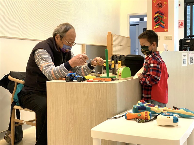 新竹市北區親子館近日新增隱形服務「修復玩具」,70歲的何寬明(左)化身「玩具醫生」,各式損壞的玩具在何寬明的巧手下都能「復活」。圖/新竹市政府