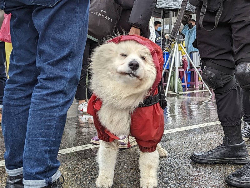 台灣動物保護行政監督聯盟20日舉辦「為動物發聲~動物保護入憲大遊行」,有民眾帶著自家毛小孩在溼冷天氣中上街頭表達支持。圖/中央社