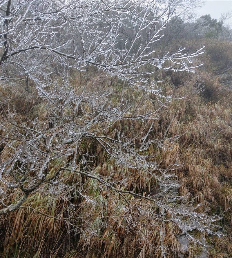 另外下午也有遊客提供位於翠峰林道11至12公里的樹枝結冰珠及霧淞,整個林道像仙境般,美麗浪漫。目前溼度99%,遊客心情興奮,愈來愈有機會期待見到雪景了。