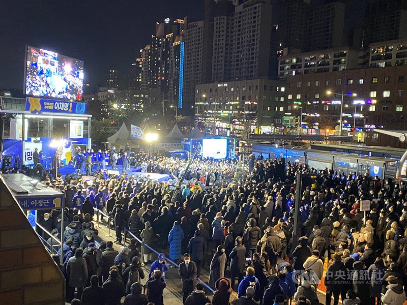 韓國總統大選競選活動期正式展開,選民不畏疫情熱情參與。圖為執政黨共同民主黨候選人李在明15日於首爾舉行造勢活動。圖/中央社