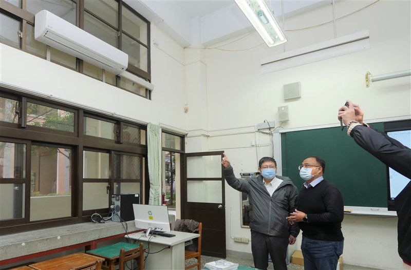 新竹縣長楊文科先前視察縣內國小冷氣安裝情況,縣內有9所山區學校有暖氣功能。圖/縣府提供