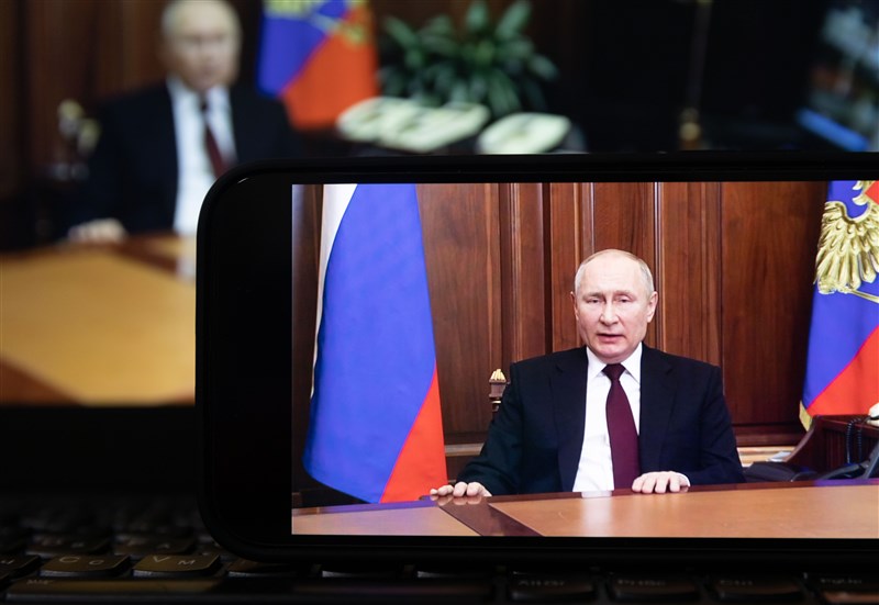 普亭21日晚間向全國發表電視談話並簽署法令,承認頓涅茨克和盧甘斯克人民共和國。圖╱新華社
