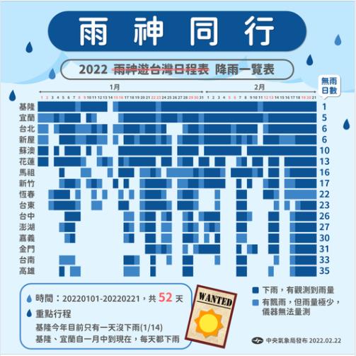 氣象局指出,統計今年1月1日至2月21日雨日,基隆有47天、台北31天、台中18天、高雄10天、花蓮33天,而且還不含毛毛雨的日子。