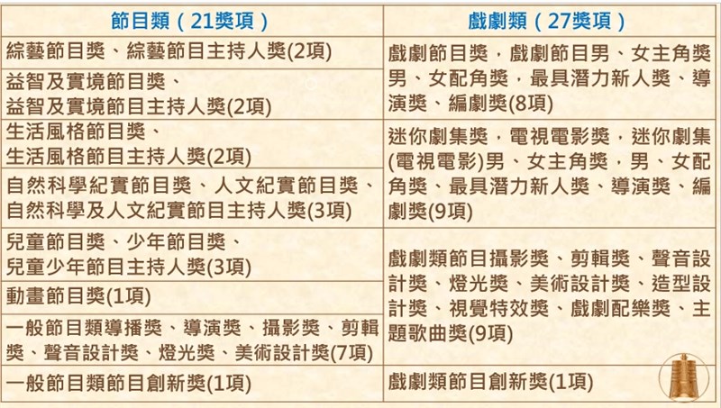 記者會由文化部政務次長李靜慧(左二)、110年電視金鐘獎總召曹瑞原導演(左一)、特別獎委員湯昇榮(螢幕上)、文化部影視及流行音樂產業局局長徐宜君(右二)共同出席,並由「視網膜」(右一)擔任主持人,針對今年度電視金鐘獎改革重點向外界說明。圖/記者曹麗蕙第二項改革也是備受關注的是,頒獎典禮將參考美國艾美獎多場次頒獎概念,分為「節目類」及「戲劇類」二場次頒獎。讓典禮時間運用更有彈性,不因獎項過多而限縮典禮企製發揮空間,以及得獎者致詞時間,進而更榮耀入圍者及獲獎者。李靜慧表示,「節目類」將頒發綜藝節目、益智及實境節目等21項獎項;「戲劇類」則頒發戲劇節目、迷你劇集及電視電影等27項獎項,共頒48項獎項。二場頒獎典禮將在10月下旬分周五、周六兩天連續舉行。