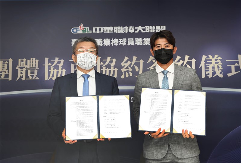 球員工會理事長陳傑憲(右)與聯盟會長蔡其昌(左)簽訂團體協約。圖/中職提供