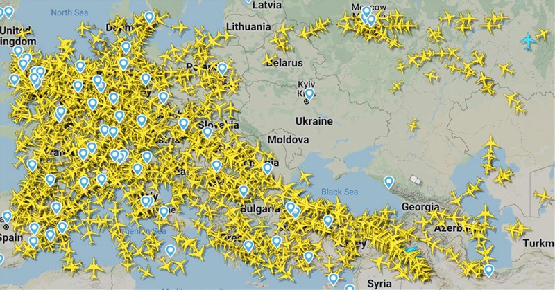 烏克蘭24日剛宣布關閉東部機場,並將部分空域列入危險區域,民用飛行器就已刻意「繞開」,在烏克蘭上方形成一個空洞。圖/翻攝自Flightradar24.com網站