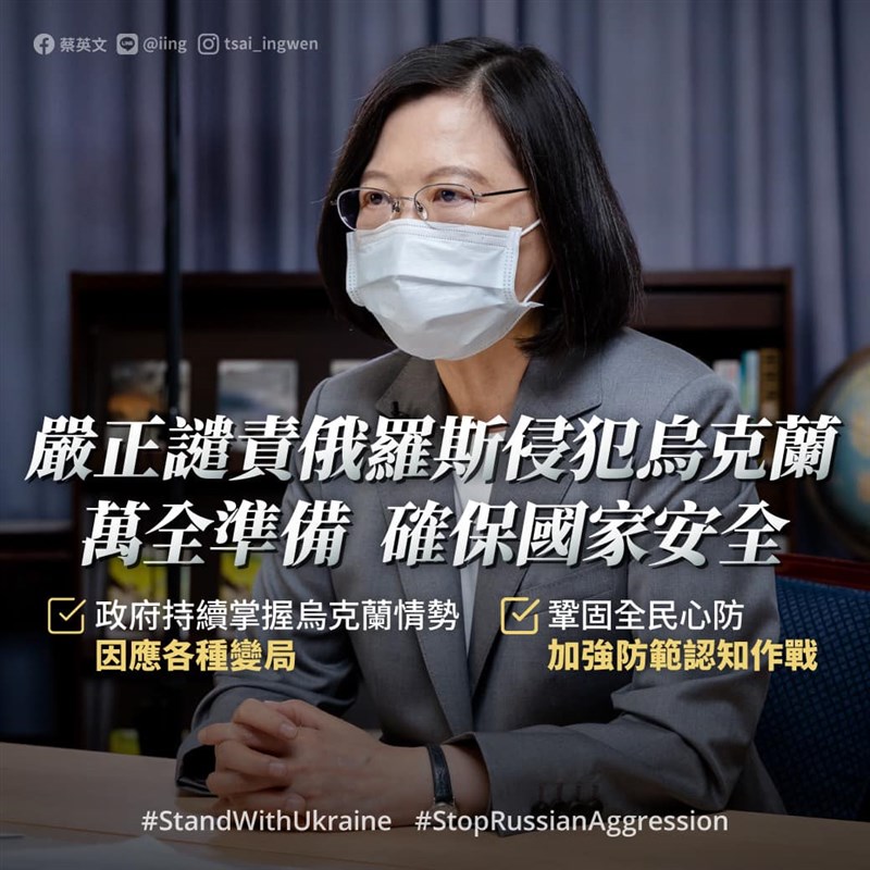 蔡英文指出,對於俄羅斯展開軍事行動,要嚴正譴責俄羅斯對烏克蘭主權的侵害,及對於區域及全球和平穩定的破壞,期盼各方儘速恢復和平對話、理性解決爭端,而台灣作為國際社會的一員,「對於有助於和平解決爭議的努力,我們都願意參與」。