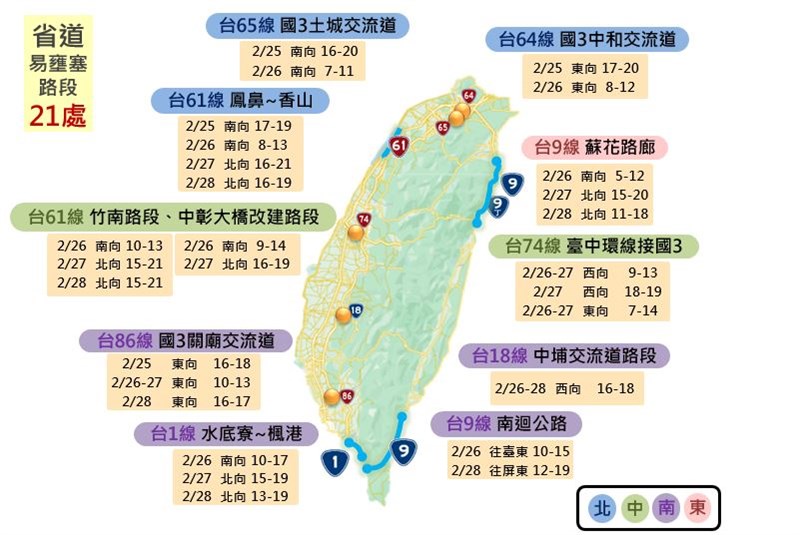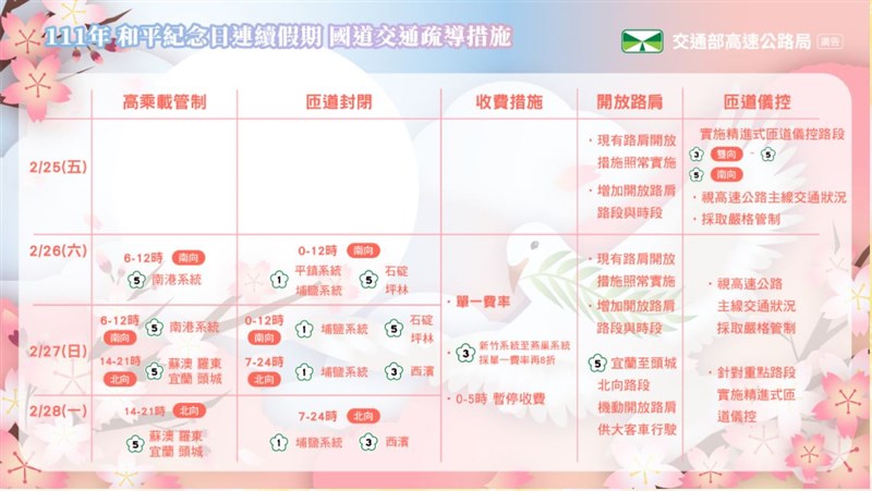 228連假不想塞車 這些資訊必須知道 |2022.02.26 語音朗讀 1523觀看次 字級 大 中 小 228連假首日,高速公路車流量大。圖為石碇交流道實施匝道儀控管制。圖/潘俊宏 【本報台北訊】今(26日)是二二八連假首日,交通部高速公路局表示,中南部國道出現零星壅塞,但和往年同期相比差不多。明天連假第二天,南下、北返車潮湧現,預估國道有13地雷路段,北返建議上午出發,南向建議下午出發。高公局說,今天下午國道壅塞路段包括國1南向楊梅至新竹、泰安服務區至台中系統;國3南向三鶯至關西服務區;國5南向坪林至頭城,至17時已陸續紓解,其餘路段均能維持行車正常。截至今晚18時,國道交通量為89.4百萬車公里,預估今日交通量為115百萬車公里,明天預估國道交通量為115百萬車公里,為年平均平日 (88百萬車公里)的1.3倍,其中北向交通量可達59百萬車公里,為年平均平日的1.3倍。●國5宜蘭到坪林 預估塞到午夜12時高公局預判明日上午重點壅塞路段,將出現在國1南向楊梅-新竹、彰化系統-埔鹽系統、北向圓山-大華系統;國3南向土城-關西、快官-霧峰系統;國5南向南港系統-頭城等路段,下午將出現在國1北向苗栗-湖口、西螺-埔鹽系統;國3關西-大溪、草屯-霧峰、竹山-中興;國5宜蘭-坪林;國6西向舊正-霧峰系統。行車時間增加三到五倍。國5宜蘭到坪林從上午11時塞到午夜12時。圖/取自高公局高公局建議西部國道南向用路人於12時後出發,南部地區北向用路人請於9時前出發、中部地區用路人於12時前出發;國5北向用路人建議於9時前出發。高公局說,明天國道相關疏導措施包括:6-12時國5南港系統南向入口高乘載管制、14-21時國5蘇澳、羅東、宜蘭及頭城等交流道北向入口匝道高乘載管制、0-12時封閉國1埔鹽系統、國5石碇及坪林等交流道南向入口、7-24時封閉國1埔鹽系統及國3西濱北向等交流道入口、單一費率、國3新竹系統至燕巢系統採單一費率再8折收費、0-5時暫停收費、開放路肩、匝道儀控等。●省道仍有出遊車朝 銜接國道路段也會塞省道部分,公路總局表示,明天預估省道主要幹道、銜接國道路段及觀光風景區周邊路段仍有出遊車潮。圖/取自公路總局包含上午時段台74線台中環線及台86接國3關廟交流道路段;下午時段北部台2線東北角路段、台3線及台7線大溪~慈湖路段、台61線鳳鼻~香山路段,中部台3線苗栗大湖路段、台14甲線霧社~清境路段、台21線日月潭周邊、台61線竹南及中彰大橋路段;南部台1線水底寮~楓港路段、台26線墾丁路段等。●客運業者機動增班 公共運輸仍有空位 公總另指出,公共運輸部分已協調客運業者,籌措足夠運能並視人潮機動增班,依據目前預售情形,西部國道客運尚有82.25%空位,東部國道客運尚有88.02%空位。圖/取自公路總局 前一篇文章 高中木聯/12強出爐 大溪分組龍頭保8寫隊史 下一篇文章 T1/英熊轟到延長險勝海神 蔣淯安再寫30+10 熱門新聞 01WTA、ATP年終賽 獎金創新高2025.11.0702健保補充保費變革 政院急踩煞車2025.11.0703補充纖維、鈣、鎂、鉀 預防多種疾病風險2025.11.1104再闖WTA年終賽 謝淑薇力拚第2冠2025.11.0705【寬鼎畫語】 看不見的真相2025.11.1006【詩】再現綠川2025.11.0707佛光山大學校長論壇 盼教育融入佛法2025.11.0808【樹博士系列】土壤的祕密XV 水稻田減排新觀念IV 土地的溫柔革命 雲林大埤寫益生菌奇蹟2025.11.0909佛光山深耕紐西蘭 毛利族傳統禮致謝2025.11.0710星雲大師全集【傳記】百年佛緣─生活篇 我的衣食住行 5-52025.11.07 訂閱電子報 台北市 天氣預報 台灣一週天氣預報 相關報導 修舊如舊 瑞三礦業整煤廠再生通霄電廠閃鳳凰 大煙囪「放倒」台近7成員工薪資 低於平均訪歐返台 蕭美琴:處境艱難不退縮魏哲家:黃仁勳來要更多晶片興達電廠 應變演練