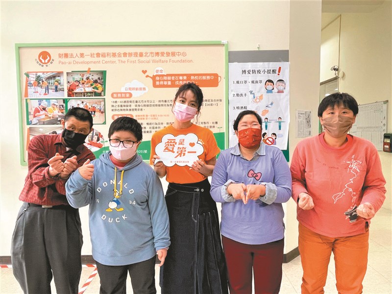 宋芸樺(中)和第一社福博愛發展中心香皂班的學員,向大眾呼籲陪伴到老。圖/第一基金會提供