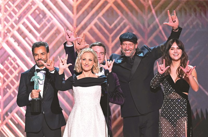 《樂動心旋律》贏得「最佳電影類整體演出」獎,演員上台領獎時,用手語比「我愛你」。圖/美聯社