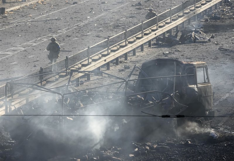 俄羅斯軍隊戰術錯誤導致入侵烏克蘭受挫,但專家表示,隨俄軍調整腳步,本周起戰況恐翻轉。圖為26日烏克蘭士兵在基輔行經一輛燒毀的軍用卡車。圖/美聯社