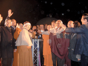 昨天由內政部長李逸洋、台南縣長蘇煥智邀請參加的宗教代表,有佛教、道教、基督教、天主教、一貫道等,於晚間七時二十五分,共同啟動並點亮宗教燈區,李部長與蘇縣長並由心培和尚陪同,在《人間福報》燈區放平安燈,祈求全民平安納福。