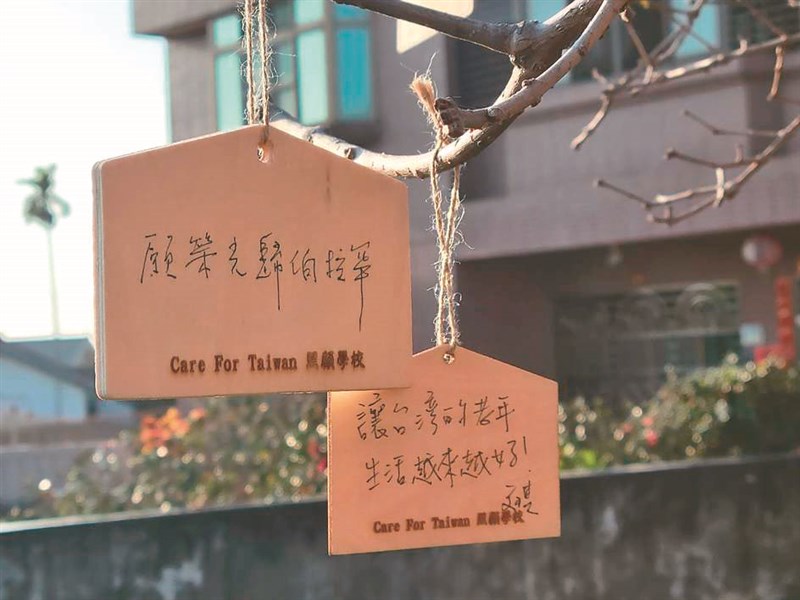 照顧學校昨日開幕,支持者在樹上掛祝福木片。